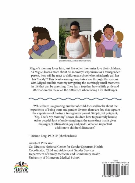 Miguel's mommy loves him, just like other mommies love their children. As Miguel learns more about his mommy's experience as a transgender parent, how will he react to children at school who mistakenly call her his "daddy"? This heartwarming story takes you through the seasons with Miguel and his mommy navigating the seemingly small moments in life that can be upsetting. They learn together how a little pride and affirmation can make all the difference when facing life's challenges. Author, Jean Mountain learned at an early age the struggle for a strong self-identity, coming from a Native American family and finding out she is half Black to acknowledging her gender Identity, to dropping out of high school. Jean wants to teach families, educators, and the general public how to address her respectfully. As her children are getting older, she is seeing the need to show how others' reactions to her gender identity affects her children.