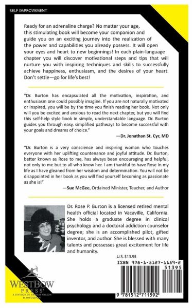 Ready for an adrenaline charge? No matter your age, this stimulating book will become your companion and guide you on an exciting journey into the realization of the power and capabilities you already possess. It will open your eyes and heart to new beginnings! In each plain-language chapter you will discover motivational steps and tips that will nurture you with inspiring techniques and skills to successfully achieve happiness, enthusiasm, and the desires of your heart. Don't settle-go for life's best! "Dr. Burton has encapsulated all the motivation, inspiration, and enthusiasm one could possibly imagine. If you are not naturally motivated or inspired, you will be by the time you finish reading her book. Not only will you be excited and anxious to read the next chapter, but you will find this self-help style book in simple, understandable language. Dr. Burton guides you through easy, simplified pathways to become successful with your goals and dreams of choice." -Dr. Jonathan St. Cyre, MD "Dr. Burton is a very conscience and inspiring woman who touches everyone with her uplifting countenance and joyful attitude. Dr. Burton, better known as Rose to me, has always been encouraging and helpful, not only to me but to all who know her. I am thankful to have Rose in my life as I have gleaned from her wisdom and determination. You will not be disappointed in her book as you will find yourself becoming as passionate as she is!" -Sue McGee, ordained minister, teacher, and author