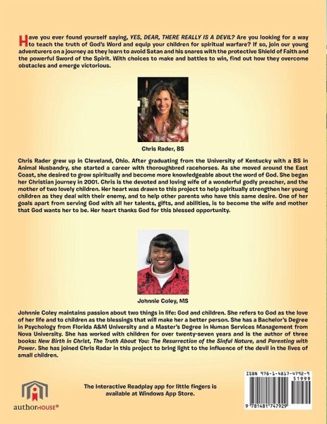 The idea for this book came while trying to explain the reality of the devil to my four year old son. After looking around for a book and not finding what I was looking for, I decided to put something together myself. After putting thoughts down on paper and drawing stick figures, I was so very blessed to meet a talented artist named Erin McKay and a devoted Christian author named Johnnie Coley, who helped me move forward with my ideas. God has designed this book to be a blessing for you, the reader and all children. To God be the Glory!