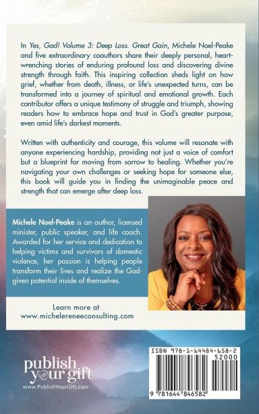 In Yes, God! Volume 3: Deep Loss. Great Gain, Michele Noel-Peake and five extraordinary coauthors share their deeply personal, heart-wrenching stories of enduring profound loss and discovering divine strength through faith. This inspiring collection sheds light on how grief, whether from death, illness, or life's unexpected turns, can be transformed into a journey of spiritual and emotional growth. Each contributor offers a unique testimony of struggle and triumph, showing readers how to embrace hope and trust in God's greater purpose, even amid life's darkest moments. Written with authenticity and courage, this volume will resonate with anyone experiencing hardship, providing not just a voice of comfort but a blueprint for moving from sorrow to healing. Whether you're navigating your own challenges or seeking hope for someone else, this book will guide you in finding the unimaginable peace and strength that can emerge after deep loss.