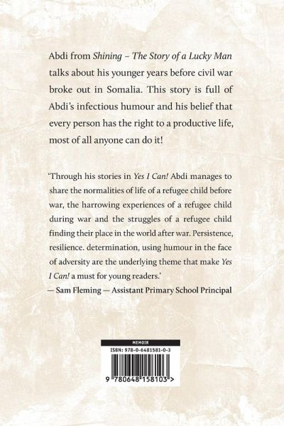 Yes I Can! is the story of Abdi Aden from the award winning SBS documentary Go Back To Where You Came From (Series 2) based in Mogadishu, Somalia before the Civil War. The story begins with his younger years up until the war and has a rich description of Somali Culture, Religion and History. Throughout the story Abdi recollects on life before the war and becoming a refugee. Abdi discusses in a humorous, uplifting spirit the positive and negative elements of his journey and how they have shaped him today. Abdi strongly believes that every person has the right to a productive, happy life and that begins with the young people. 'Anything is possible if you try, and try again. I am living proof of that.'