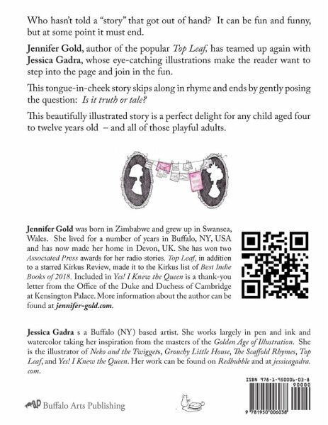 Who hasn't told a "story" that got out of hand? It can be fun and funny, but at some point it must end. Jennifer Gold, author of the popular Top Leaf, has teamed up again with Jessica Gadra, whose eye-catching illustrations make the reader want to step into the page and join in the fun. This tongue-in-cheek story skips along in rhyme and ends by gently posing the question: Is it truth or tale? A perfect delight for any child - and all of those playful adults.