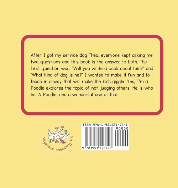 After I got my service dog Theo, everyone kept asking me two questions: 'Will you write a book about him?' and 'What kind of dog is he?' This book is the answer to both. I wanted to make it a fun and humorous way to teach. People of all ages learn more when they are having fun, so a book about Poodles that will make you giggle seemed perfect. There is more to 'Yes, I'm a Poodle!' than silliness, it also explores the topic of not judging others. Theo is who he is-a Poodle, and a wonderful one at that. Bonus pages at the back further explore the history of Poodles, and some interesting and important facts about service dogs in general.