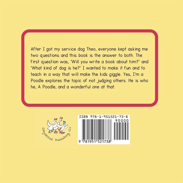 After I got my service dog Theo, everyone kept asking me two questions: 'Will you write a book about him?' and 'What kind of dog is he?' This book is the answer to both. I wanted to make it a fun and humorous way to teach. People of all ages learn more when they are having fun, so a book about Poodles that will make you giggle seemed perfect. There is more to 'Yes, I'm a Poodle!' than silliness, it also explores the topic of not judging others. Theo is who he is-a Poodle, and a wonderful one at that. Bonus pages at the back further explore the history of Poodles, and some interesting and important facts about service dogs in general.