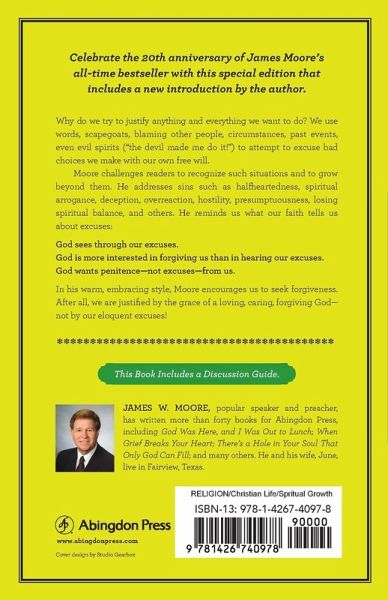 Celebrate the 20th Anniversary of this beloved, never out of print, James Moore book with this special edition that includes a new introduction by the author. Why do we try to justify anything and everything we want to do? We use words, scapegoats, blaming other people, circumstances, past events, even evil spirits ( the devil made me do it! ) to attempt to excuse bad choices we make with our own free will. Moore challenges readers to recognize such situations and to grow beyond them. He addresses such sin as half-heartedness, spiritual arrogance, deception, overreaction, hostility, presumptuousness, losing spiritual balance, and more. He reminds us what our faith tells us about excuses, which is God . . . sees through. is more interested in forgiving us than in hearing our excuses. wants penitence not excuses from us. In his warm, embracing style, James Moore encourages us to seek forgiveness. After all, we are justified by the grace of a loving, caring, forgiving, God and not our eloquent excuses. Perfect as a 12 session small group study using the Leader Guide in back."