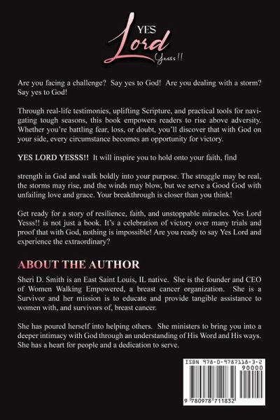 What happens when a woman, facing life's fiercest storms, decides to trust God completely? In Yes Lord! Yesss!!, one woman's incredible journey of faith will ignite your spirit and leave you breathless. From moments of crushing doubt and relentless trials, she boldly declared "Yes Lord!"- and God didn't just show up, He showed out. Through raw, powerful testimonies of miraculous breakthroughs, this book takes you on a heart-pounding ride through divine interventions, unbelievable victories, and life-altering moments where the trust in God made the impossible possible. Each page crackles with the electric energy of God's power at work, reminding us all that when we trust God with everything, He will do more than we could ever imagine. Get ready for a story of resilience, faith, and unstoppable miracles. Yes Lord! Yesss!! is not just a book. It's a celebration of victory over many trials and proof that with God, nothing is impossible! Are you ready to say Yes Lord and experience the extraordinary? Are you are facing a challenge? Say yes to God! Are you are dealing with a storm? Say yes to God! Through real-life testimonies, uplifting Scripture, and practical tools for navigating tough seasons, this book empowers readers to rise above adversity. Whether you're battling fear, loss, or doubt, you'll discover that with God on your side, every circumstance becomes an opportunity for victory. Perfect for personal reflection, group study, or as a gift for someone facing a storm. YES LORD! YESSS!! It will inspire you to hold onto your faith, find strength in God and walk boldly into your purpose. The struggle may be real, the storms may rise, and the winds may blow, but we serve a Good God with unfailing love and grace. Your breakthrough is closer than you think!