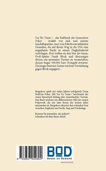 Yes No Texas ! - das Kultbuch der Generation Poker - erzählt von Jack und seinem Geschäftspartner, zwei vom Pokerboom infizierten Freunden, die auf ihrem Weg in die USA eine ungeplante Nacht in einem Flughafenhotel verbringen. Dort treffen sie den Star der Szene, Profi-Spieler Frank Block und überzeugen diesen, ein spontanes Turnier zu veranstalten, dessen Sieger 100.000 Euro Preisgeld erwartet. Ein junger Internet-Gamer wird zur Verstärkung gegen Block engagiert...D
