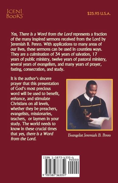 Yes, There Is a Word from the Lord represents a fraction of the many inspired sermons received from the Lord by Jeremiah B. Penro. With applications to many areas of our lives, these sermons can be used in countless ways. They are a culmination of 34 years of salvation, 17 years of public ministry, twelve years of pastoral ministry, several years of evangelism, and many years of prayer, fasting, consecration, and study. It is the author's sincere prayer that this presentation of God's most precious word will be used to benefit, enhance, and stimulate Christians on all levels, whether they be preachers, evangelists, missionaries, teachers, or laymen in your study. The world needs to know in these crucial times that yes, there is a Word from the Lord.