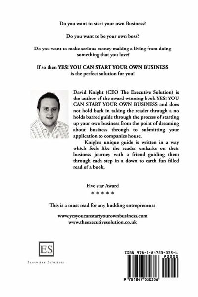 Do you want to start your own Business? Do you want to be your own boss? Do you want to make serious money making a living from doing something that you love? If so then YES! YOU CAN START YOUR OWN BUSINESS is the perfect solution for you! David Knight (CEO The Executive Solution) is the author of the award winning book YES! YOU CAN START YOUR OWN BUSINESS and does not hold back in taking the reader through a no holds barred guide through the process of starting up your own business from the point of dreaming about business through to submitting your accounts. Knights unique guide is written in a way which feels like the reader embarks on their business journey with a friend guiding them through each step in a down to earth fun filled read of a book. * * * * * Five star Award This is a must read for any budding entrepreneurs www.yesyoucanstartyourownbusiness.com www.theexecutivesolution.co.uk