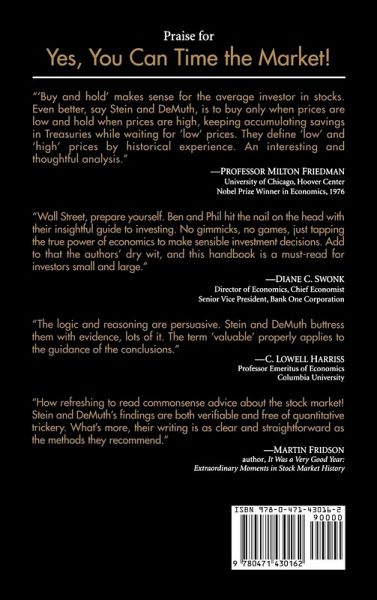 Praise for Yes, You Can Time the Market! "'Buy and hold' makes sense for the average investor in stocks. Even better, say Stein and DeMuth, is to buy only when prices are low and hold when prices are high, keeping accumulating savings in Treasuries while waiting for 'low' prices. They define 'low' and 'high' prices by historical experience. An interesting and thoughtful analysis." -Professor Milton Friedman University of Chicago, Hoover Center Nobel Prize Winner in Economics, 1976 "Wall Street, prepare yourself. Ben and Phil hit the nail on the head with their insightful guide to investing. No gimmicks, no games, just tapping the true power of economics to make sensible investment decisions. Add to that the authors' dry wit, and this handbook is a must-read for investors small and large." -Diane C. Swonk Director of Economics, Chief Economist Senior Vice President, Bank One Corporation " The logic and reasoning are persuasive. Stein and DeMuth buttress them with evidence, lots of it. The term 'valuable' properly applies to the guidance of the conclusions." -C. Lowell Harriss Professor Emeritus of Economics Columbia University "How refreshing to read commonsense advice about the stock market! Stein and DeMuth's findings are both verifiable and free of quantitative trickery. What's more, their writing is as clear and straightforward as the methods they recommend." -Martin Fridson author, It Was a Very Good Year: Extraordinary Moments in Stock Market History