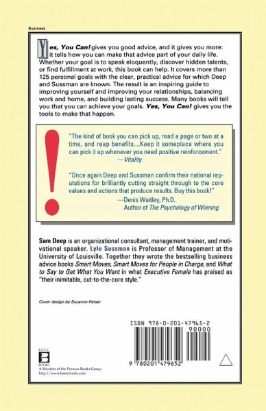 Yes, You Can! gives you good advice, and it gives you more: it tells how you can make that advice part of your daily life. Whether your goal is to speak eloquently, discover hidden talents, or find fulfillment at work, this book can help. It covers more than 125 personal goals with the clear, practical advice for which Deep and Sussman are known. The result is an inspiring guide to improving yourself and improving your relationships, balancing work and home, and building lasting success. Many books will tell you that you can achieve your goals. Yes, You Can!gives you the tools to make that happen.