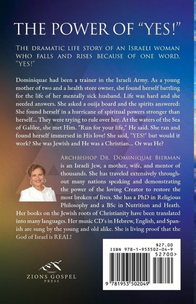 The Power of "YES!" The dramatic life story of an Israeli woman who falls and rises because of one word, "YES!" Dominiquae had been a trainer in the Israeli Army. As a young mother of two and a health store owner, she found herself battling for the life of her mentally sick husband. Life was hard and she needed answers. She asked a ouija board and the spirits answered: She found herself in a hurricane of spiritual powers stronger than herself... They were trying to rule over her. At the waters of the Sea of Galilee, she met Him. "Run for your life," He said. She ran and found herself immersed in His love! She said, "YES!" but would it work? She was Jewish and He was a Christian... Or was He? Archbishop Dr. Dominiquae Bierman is an Israeli Jew, a mother, wife, and mentor of thousands. She has traveled extensively throughout many nations speaking and demonstrating the power of the loving Creator to restore the most broken of lives. She has a PhD in Religious Philosophy and a BSc in Nutrition and Heath. Her books on the Jewish roots of Christianity have been translated into many languages. Her music CD's in Hebrew, English, and Spanish are sung by the young and old alike. She is living proof that the God of Israel is REAL!