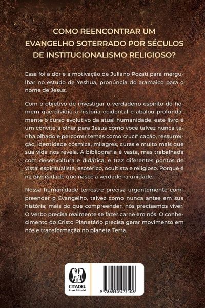 "Como reencontrar um Evangelho soterrado por séculos de institucionalismo religioso? Essa foi a dor e a motivação de Juliano Pozati para mergulhar no estudo de Yeshua, pronúncia do aramaico para o nome de Jesus. Com o objetivo de investigar o verdadeiro espírito do homem que dividiu a história ocidental e abalou profundamente o curso evolutivo da atual humanidade, este livro é um convite para olhar para Jesus como você talvez nunca tenha olhado e percorrer temas como crucificação, ressurreição, identidade cósmica, milagres, curas e muito mais que sua vida nos revela. A bibliografia é vasta, mas trabalhada com desenvoltura e didática, e traz diferentes pontos de vista: espiritualista, esotérico, ocultista e religioso. Porque é na diversidade que nasce a verdadeira unidade. Nossa humanidade terrestre precisa urgentemente compreender o Evangelho, talvez como nunca antes em sua história; mais do que compreender, nós precisamos viver. O Verbo precisa realmente se fazer carne em nós. O conhecimento do Cristo Planetário precisa gerar movimento em nós e transformação no planeta Terra."