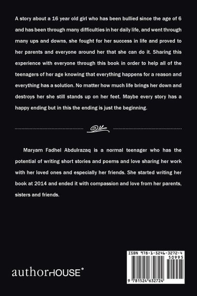 A story about a 16 year old girl who has been bullied since the age of 6 and has been through many difficulties in her daily life, and went through many ups and downs, she fought for her success in life and proved to her parents and everyone around her that she can do it. Sharing this experience with everyone through this book in order to help all of the teenagers of her age knowing that everything happens for a reason and everything has a solution. No matter how much life brings her down and destroys her she still stands up on her feet. Maybe every story has a happy ending but in this the ending is just the beginning.