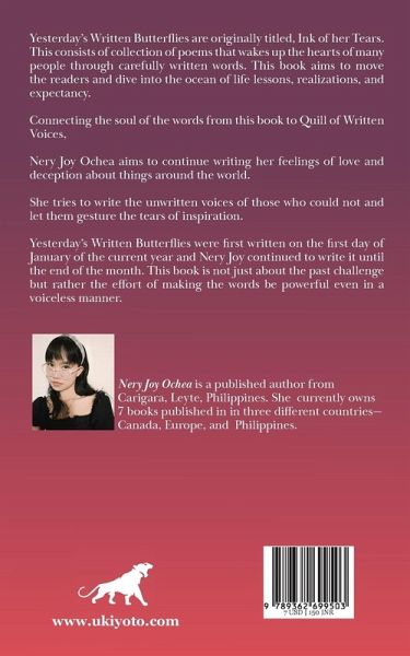 Yesterday's Written Butterflies are originally titled, Ink of her Tears. This consists of collection of poems that wakes up the hearts of many people through carefully written words. This book aims to move the readers and dive into the ocean of life lessons, realizations, and expectancy. Connecting the soul of the words from this book to Quill of Written Voices, Nery Joy Ochea aims to continue writing her feelings of love and deception about things around the world. She tries to write the unwritten voices of those who could not and let them gesture the tears of inspiration. Yesterday's Written Butterflies were first written on the first day of January of the current year and Nery Joy continued to write it until the end of the month. This book is not just about the past challenge but rather the effort of making the words be powerful even in a voiceless manner.