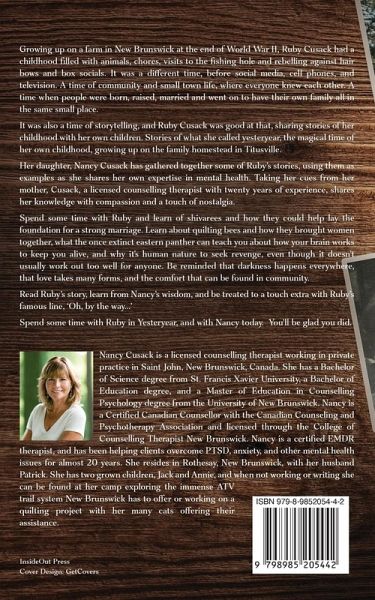 Growing up on a farm in New Brunswick at the end of World War II, Ruby Cusack had a childhood filled with animals, chores, visits to the fishing hole and rebelling against hair bows and box socials. It was a different time, before social media, cell phones, and television. A time of community and small town life, where everyone knew each other. A time when people were born, raised, married and went on to have their own family all in the same small place. It was also a time of storytelling, and Ruby Cusack was good at that, sharing stories of her childhood with her own children. Stories of what she called yesteryear, the magical time of her own childhood, growing up on the family homestead in Titusville. Her daughter, Nancy Cusack has gathered together some of Ruby's stories, using them as examples as she shares her own expertise in mental health. Taking her cues from her mother, Cusack, a licensed counselling therapist with twenty years of experience, shares her knowledge with compassion and a touch of nostalgia. Spend some time with Ruby and learn of shivarees and how they could help lay the foundation for a strong marriage. Learn about quilting bees and how they brought women together, what the once extinct eastern panther can teach you about how your brain works to keep you alive, and why it's human nature to seek revenge, even though it doesn't usually work out too well for anyone. Be reminded that darkness happens everywhere, that love takes many forms, and the comfort that can be found in community. Read Ruby's story, learn from Nancy's wisdom, and be treated to a touch extra with Ruby's famous line, 'Oh, by the way...' Spend some time with Ruby in Yesteryear, and with Nancy today. You'll be glad you did.