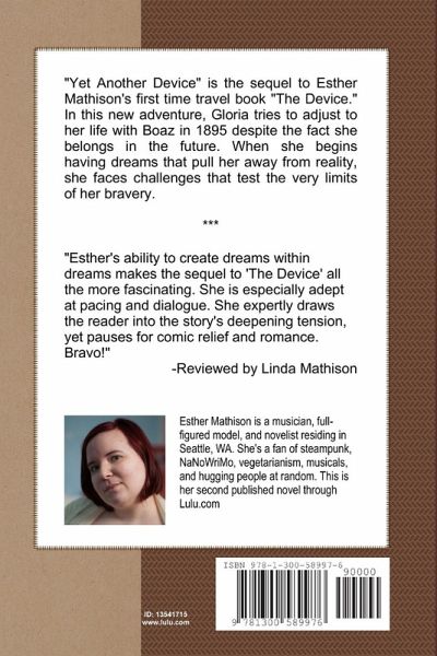 "Yet Another Device" is the sequel to Esther Mathison's first time travel book "The Device." In this new adventure, Gloria tries to adjust to her life with Boaz in 1895 despite the fact she belongs in the future. When she begins having dreams that pull her away from reality, she faces challenges that test the very limits of her bravery.