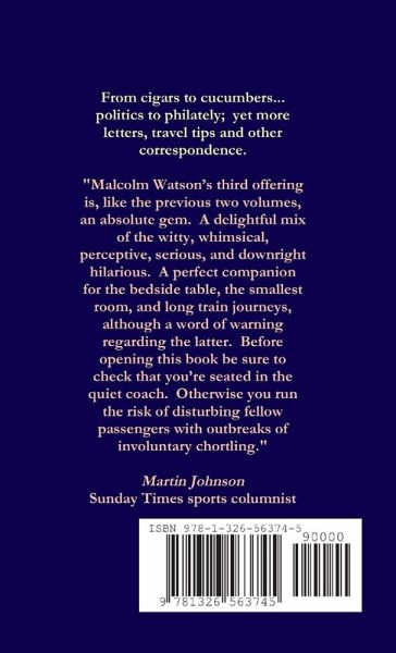 A further compilation of letters, travel tips and other correspondence, sent to newspapers and a variety of other publications - cigars to cucumbers, politics to philately. "A delightful mix of witty, whimsical, perceptive, serious, and downright hilarious." Martin Johnson, Sunday Times sports columnist.