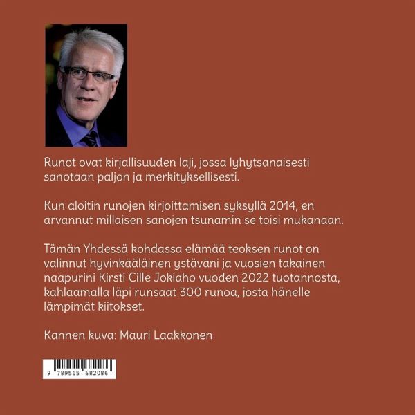 Runot ovat kirjallisuuden laji, jossa lyhytsanaisesti sanotaan paljon ja merkityksellisesti. Kun aloitin runojen kirjoittamisen syksyllä 2014, en arvannut millaisen sanojen tsunamin se toisi mukanaan. Tämän Yhdessä kohdassa elämää teoksen runot on valinnut hyvinkääläinen ystäväni ja vuosien takainen naapurini Kirsti Cille Jokiaho vuoden 2022 tuotannosta, kahlaamalla läpi runsaat 300 runoa, josta hänelle lämpimät kiitokset.