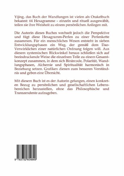 Yijing, das Buch der Wandlungen ist vielen als Orakelbuch bekannt: 64 Hexagramme, einzeln und rituell ausgewählt, teilen sie ihre Weisheit zu einem persönlichen Anliegen mit. Die Autorin dieses Buches wechselt jedoch die Perspektive und fügt diese Hexagramm-Perlen zu einer Perlenkette zusammen. Für ein menschliches Wesen entsteht in sieben Entwicklungsphasen ein Weg, der gemäß dem Dao-Verwirklichen einer natürlichen Ordnung folgen will. Aus diesem systemischen Blickwinkel heraus schließen sich auf beeindruckende Weise die einzelnen Teile zu einem Gesamtkonzept zusammen, in dem sich Binärcode, Polarität, Wandlungsphasen, Alchemie und Spiritualität harmonisch in Beziehung setzen. Grafiken dienen zum besseren Verständnis und geben eine Übersicht.Mit diesem Buch ist es der Autorin gelungen, einen konkreten Bezug zu persönlichen und gesellschaftlichen Lebensbereichen herzustellen, ohne das Philosophische und Transzendente aufzugeben.