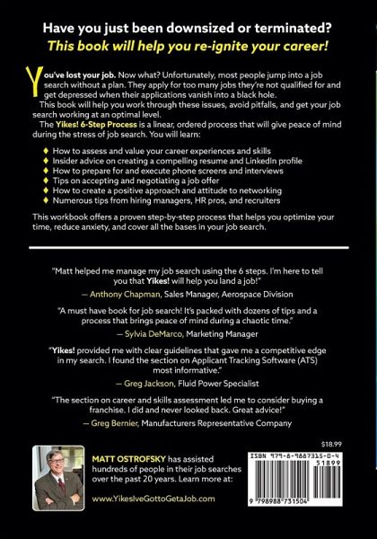 Have you just been downsized or terminated? This book will help you re-ignite your career! You've lost your job. Now what? Unfortunately, most people jump into a job search without a plan. They apply for jobs they're not qualified for and get depressed when their applications vanish into a black hole. This book will help you work through these issues, avoid pitfalls, and get your job search working at an optimal level. The Yikes! 6-Step Process is a linear, ordered process that will give peace of mind during the stress of job search. You will learn:How to assess and value your career experiences and skills Insider advice on creating a compelling resume and LinkedIn profile How to prepare for and execute phone screens and interviews Tips on accepting and negotiating a job offer How to remove the dread of networking by offering to help others Numerous tips for mid-career job seekers from HR and recruiters This workbook offers a proven step-by-step process that helps you optimize your time, reduce anxiety, and cover all the bases in your job search.