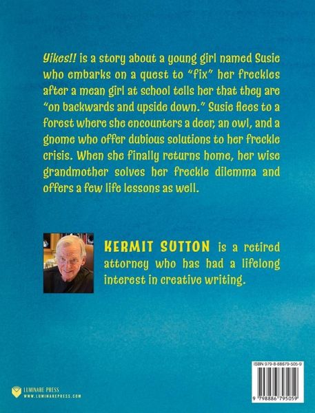 Yikes!! is a story about a young girl named Susie who embarks on a quest to "fix" her freckles after a mean girl at school tells her that they are "on backwards and upside down." Susie flees to a forest where she encounters a deer, an owl, and a gnome who offer dubious solutions to her freckle crisis. When she finally returns home, her wise grandmother solves her freckle dilemma and offers a few life lessons as well.
