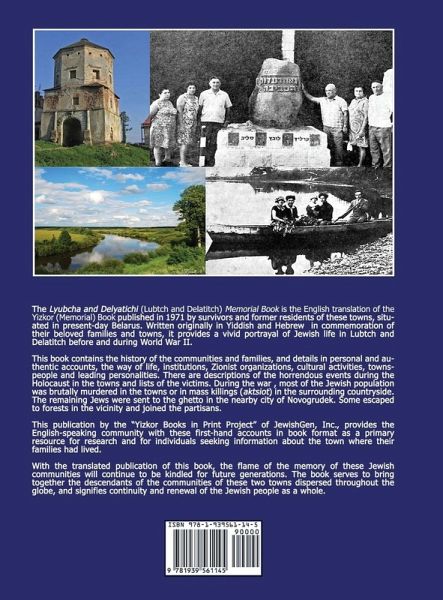 The Lyubcha and Delyatichi (Lubtch and Delatitch) Memorial Book is the English translation of the Yizkor (Memorial) Book published in 1971 by survivors and former residents of these towns, situated in present-day Belarus. Written originally in Yiddish and Hebrew by former residents in commemoration of their beloved families and towns, it provides a vivid portrayal of Jewish life in Lubtch and Delatitch before and during World War II. This publication serves to provide the English-speaking community with these first-hand accounts and serves as a primary resource for research and for individuals seeking information about the town where their families had lived. With the publication of this book, the flame of the memory of these Jewish communities will continue to be kindled for future generations nation as a whole. Alternate names for the towns are: Lyubcha [Russian], Lubcza [Polish], Lubtsh [Yiddish], Lubca [Belorussian], Lubcz, Lubec, Lubecz, Lubch, Lubtse, Lyubch, Lubtch, Lubtz, Ljubcha Delyatichi [Russian], Delatycze [Polish], Delatitch [Yiddish], Dzialacicy [Belorussian], Delyatyche, Dzjaljacicy