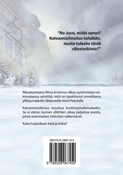 Liisa Murto tekee katoamisilmoituksen Kirsti Pekolasta, josta ei ole kuullut mitään sen jälkeen, kun hän oli kertonut lähtevänsä yllätysmatkalle. Pekola on varakas leski. Rikoskomisario Ritva Arvetvuo alkaa tutkia tapausta kollegansa Kolin kanssa. Pian selviää katoamiseen liittyvän epäilyttäviä piirteitä. Pekola löytyy hukkuneena. Ruumiinavauksen tulos hämmästyttää tutkijoita. Tutkimus muuttuu murhatutkimukseksi. Pekola on selvittänyt miesystävänsä Rantalan taustat. Puhelutietojen avulla selvitetään Pekolan puhelinkeskustelut. Piiri on pieni, ei löydy motiivia, eikä alibia. Mökiltä löytyneet…mehr