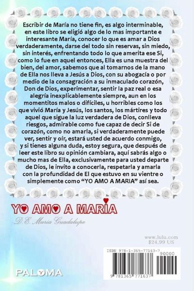 "YO AMO A MARIA" , escribir de María no tiene fin, es algo interminable, en este libro se eligió algo de lo mas importante e interesante de Mamita María, Ella es una muestra del bien, del amor, su Fiat, tambien sabemos que al tomarnos de la mano de Ella nos lleva a Jesús a Dios, por medio de su abogacía o por la consagracion su inmaculado corazón, (ICM Don de Dios), saber que obedecer y entregarse a la voluntad de Dios fielmente, conlleva riesgos, admirable como fue capaz de decir aquel Si de corazón, como no amarla, como no agradecerle, este libro en su honor por su "Si", ahora, muy claro, si verdaderamente usted puede ver, sentir y oír, estará de acuerdo conmigo, pero si tiene alguna duda, estoy segura, que después de leer este libro su opinión cambiara, aquí sabrás algo mas o mucho mas de Ella, exclusivamente para usted departe de Dios, le invito a conocerla, respetarla y amarla con la profundidad de El que estuvo en su vientre o simplemente como "YO AMO A MARIA".