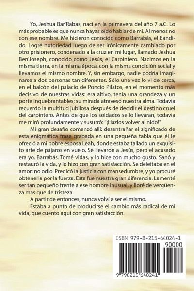 Yo, Jeshua Bar'Rabas, nací en la primavera del año 7 a.C. Lo más probable es que nunca hayas oído hablar de mí. Al menos no con ese nombre. Me hicieron conocido como Barrabás, el Bandido. Logré notoriedad luego de ser irónicamente cambiado por otro prisionero, condenado a la cruz en mi lugar, llamado Jeshua Ben'Joseph, conocido como Jesús, el Carpintero. Nacimos en la misma tierra, en la misma época, con la misma condición social y llevamos el mismo nombre. Y, sin embargo, nadie podría imaginarse a dos personas tan diferentes. Sólo una vez lo vi de cerca, en el balcón del palacio de Poncio Pilatos, en el momento más decisivo de nuestras vidas: era altivo, tenía una grandeza y un porte inquebrantables; su mirada atravesó nuestra alma. Todavía recuerdo la multitud jubilosa después de decidir el destino cruel del carpintero. Antes de que los soldados se lo llevaran, todavía me miró profundamente y susurró: "¡Hazlos volver al nido!" Mi gran desafío comenzó allí: desentrañar el significado de esta enigmática frase grabada en una pequeña tabla que él le ofreció a mi pobre esposa Leah, donde estaba tallado un exquisito arte de pájaros en vuelo. Se llevaron a Jesús, pero el acusado era yo, Barrabás. Tomé vidas, y lo hice con mucho gusto. Sanó y restauró la vida, y lo hizo con gran satisfacción. Se deleitaba en el amor; no odio. Predicó la justicia con mansedumbre, y yo procuré obtenerla por la fuerza. Esta fue nuestra gran diferencia. Lamenté ser tan pequeño frente a ese hombre inusual, y lloré de vergüenza más que de tristeza. A partir de entonces, nunca volví a ser el mismo. Estaba a punto de producirse el cambio más radical de mi vida, que cuento aquí con gran satisfacción.