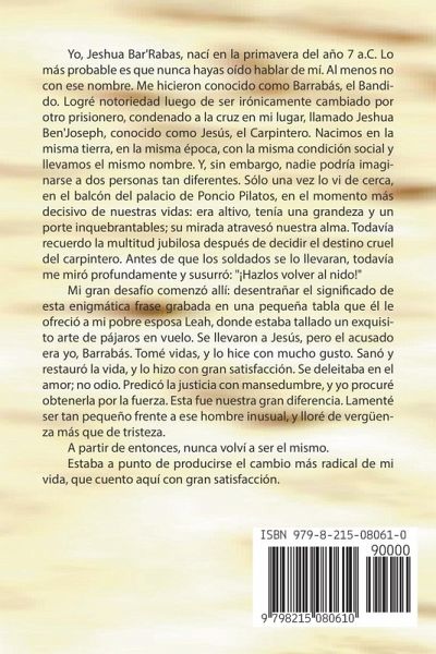 Yo, Jeshua Bar'Rabas, nací en la primavera del año 7 a.C. Lo más probable es que nunca hayas oído hablar de mí. Al menos no con ese nombre. Me hicieron conocido como Barrabás, el Bandido. Logré notoriedad luego de ser irónicamente cambiado por otro prisionero, condenado a la cruz en mi lugar, llamado Jeshua Ben'Joseph, conocido como Jesús, el Carpintero. Nacimos en la misma tierra, en la misma época, con la misma condición social y llevamos el mismo nombre. Y, sin embargo, nadie podría imaginarse a dos personas tan diferentes. Sólo una vez lo vi de cerca, en el balcón del palacio de Poncio Pilatos, en el momento más decisivo de nuestras vidas: era altivo, tenía una grandeza y un porte inquebrantables; su mirada atravesó nuestra alma. Todavía recuerdo la multitud jubilosa después de decidir el destino cruel del carpintero. Antes de que los soldados se lo llevaran, todavía me miró profundamente y susurró: "¡Hazlos volver al nido!" Mi gran desafío comenzó allí: desentrañar el significado de esta enigmática frase grabada en una pequeña tabla que él le ofreció a mi pobre esposa Leah, donde estaba tallado un exquisito arte de pájaros en vuelo. Se llevaron a Jesús, pero el acusado era yo, Barrabás. Tomé vidas, y lo hice con mucho gusto. Sanó y restauró la vida, y lo hizo con gran satisfacción. Se deleitaba en el amor; no odio. Predicó la justicia con mansedumbre, y yo procuré obtenerla por la fuerza. Esta fue nuestra gran diferencia. Lamenté ser tan pequeño frente a ese hombre inusual, y lloré de vergüenza más que de tristeza. A partir de entonces, nunca volví a ser el mismo. Estaba a punto de producirse el cambio más radical de mi vida, que cuento aquí con gran satisfacción.