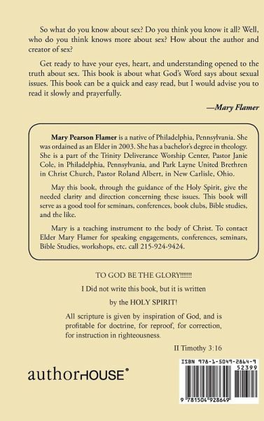 So what do you know about sex? Do you think you know it all? Well, who do you think knows more about sex? How about the author and creator of sex? Get ready to have your eyes, heart, and understanding opened to the truth about sex. This book is about what God's Word says about sexual issues. This book can be a quick and easy read, but I would advise you to read it slowly and prayerfully. -Mary Flamer