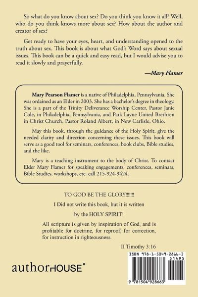 So what do you know about sex? Do you think you know it all? Well, who do you think knows more about sex? How about the author and creator of sex? Get ready to have your eyes, heart, and understanding opened to the truth about sex. This book is about what God's Word says about sexual issues. This book can be a quick and easy read, but I would advise you to read it slowly and prayerfully. -Mary Flamer