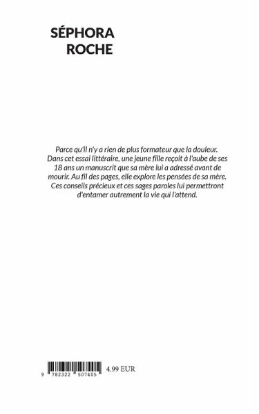 Parce qu'il n'y a rien de plus formateur que la douleur. Dans cet essai littéraire, une jeune fille reçoit à l'aube de ses 18 ans un manuscrit que sa mère lui a adressé avant de mourir. Au fil des pages, elle explore les pensées de sa mère. Ces conseils précieux et ces sages paroles lui permettront d'entamer autrement la vie qui l'attend.