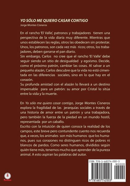 En el rancho 'El Valle', patronos y trabajadores tienen una perspectiva de la vida diaria muy diferente. Mientras que unos establecen las reglas, otros las obedecen sin protestar. Unos, los patronos, son cada vez más ricos; otros, los trabajadores, deben ganarse el pan diario. Sin embargo, Carlos no cree que el rancho 'El Valle' debe seguir siendo un sitio de desigualdad y egoísmo. Decide, como el próximo patrón, cambiar las cosas. Al salvar a un pequeño alazán, Carlos descubre que la vida no está cimentada en las diferencias sociales, sino en lo que hay en el corazón. Su profunda amistad con el alazán lo llevará a un destino impensable para un patrón: su amor por Cristal lo sitúa entre la vida y la muerte. En Yo sólo me quiero casar contigo, Jorge Montes Cisneros explora la fragilidad de las jerarquías sociales a través de una historia de amor entre un patrón y una trabajadora, pero también la fuerza de la piedad en un mundo hostil, representada por un caballo. Escrito con la intuición de quien conoce la realidad de los campos, este breve pero contundente cuento nos recuerda que, a veces, los animales son más humanos que los humanos, pues sus corazones no distinguen ricos de pobres ni blancos de pardos. Como seres humanos, divididos según quién tiene más, tenemos mucho que aprender de la pureza animal. A esto aspiran las palabras del autor.