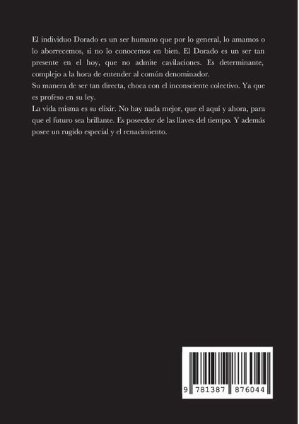 El individuo Dorado es un ser humano que por lo general, lo amamos o lo aborrecemos, si no lo conocemos en bien. El Dorado es un ser tan presente en el hoy, que no admite cavilaciones. Es determinante, complejo a la hora de entender al común denominador. Su manera de ser tan directa, choca con el inconsciente colectivo. Ya que es profeso en su ley. La vida misma es su elixir. No hay nada mejor, que el aquí y ahora, para que el futuro sea brillante. Es poseedor de las llaves del tiempo. Y además posee un rugido especial y el renacimiento.