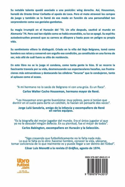 Su notable talento quedó asociado a una posición: wing derecho. Así, Houseman, heredó de Oreste Omar Corbatta el apodo de Loco. Pero el mote atravesó los campos de juego y también se lo llamó de ese modo en función de una personalidad tan sorprendente como sus geniales gambetas. Su magia irrumpió en el Huracán del '73. Un año después, cautivó al mundo en Alemania '74. Pero casi tan rápido como se había encendido, su luz se apagó. Su espíritu autodestructivo provocó que su carrera se diluyera y hasta puso en peligro su propia vida. Su sentimiento villero lo distinguió. Criado en la villa del Bajo Belgrano, tomó como bandera sus raíces y conservó con orgullo esa condición, ya constituida en una forma de ser, más allá de cuál fuera su sitio de residencia. En este libro no se lo juzga ni condena, como tanta gente lo hizo. Sí se recorre la fascinante travesía por su vida, desmenuzando sus espectaculares hazañas, sus frustraciones más estruendosas y destacando las célebres "locuras" que lo condujeron, tanto al aplauso como al ocaso. "A mi hermano no lo sacás de Belgrano ni con una grúa. Es un fiaca". Carlos Walter Cacho Houseman, hermano mayor de René. "Los Houseman eran gente buenísima: muy pobres, pero si tenían que dormir en el suelo para darte un colchón, lo hacían sin pensarlo dos veces". Jorge Lulú Sanabria, amigo de la infancia y excompañero de René en varios equipos. "Es la biografía del mejor jugador del mundo. Era el único jugador al que yo no le descubrí ningún defecto. En su plenitud, fue el mejor de todos". Carlos Babington, excompañero en Huracán y la Selección. "Sigo creyendo que futbolísticamente no le falta nada más. Lo que le falta es lo otro: hacerse hombre, conocer la vida, ubicarse, tomar conciencia de lo que realmente es y puede llegar a ser dentro del fútbol". César Luis Menotti a la revista El Gráfico, agosto de 1974.