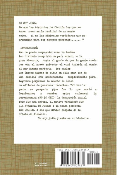Creo en la ambición del hombre y en su mediocridad de matar por que el que toma como escudo una pistola regala su alma al fuego. CGDC Yo soy judía es un libro que relata la vida de una judía que pierde toda su familia en los campos de concentración nazis, pero pese a todas las adversidades el darse por vencida no está en su mente, muestra de supervivencia, que demuestra que en las peores circunstancias el salir adelante es posible.