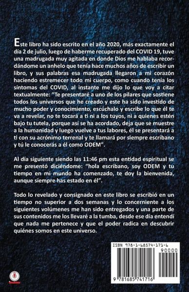 Este libro ha sido escrito en el año 2020, más exactamente el día 2 de julio, luego de haberme recuperado del COVID 19, tuve una madrugada muy agitada en donde Dios me hablaba recordándome un anhelo que tenía hace muchos años de escribir un libro, y sus palabras esa madrugada llegaron a mi corazón haciendo estremecer todo mi cuerpo, como cuando tenía los síntomas del COVID, al instante me dijo lo que voy a citar textualmente: "Te presentaré a uno de los pilares que sostiene todos los universos que he creado y este ha sido investido de mucho poder y conocimiento, escúchalo y escribe lo que él te va a revelar, no te tocará a ti ni a los tuyos, ni a quienes estén bajo tu tutela, porque así se ha acordado, deja que se muestre a la humanidad y luego vuelve a tus labores, él se presentará a ti con su acrónimo terrenal y te llamará por siempre escribano y tú le conocerás a él como ODEM". Al día siguiente siendo las 11:46 pm esta entidad espiritual se me presentó diciéndome: "hola escribano, soy ODEM y tu tiempo en mi mundo ha comenzado, te doy la bienvenida, aunque siempre has estado en él". Todo lo revelado y consignado en este libro se escribió en un tiempo no superior a dos semanas y lo concerniente a los siguientes volúmenes me han sido entregados y una parte de sus contenidos me los llevaré a la tumba, desde ese día entendí que nada me pertenece y que el poder radica en descubrir quiénes somos en este universo.