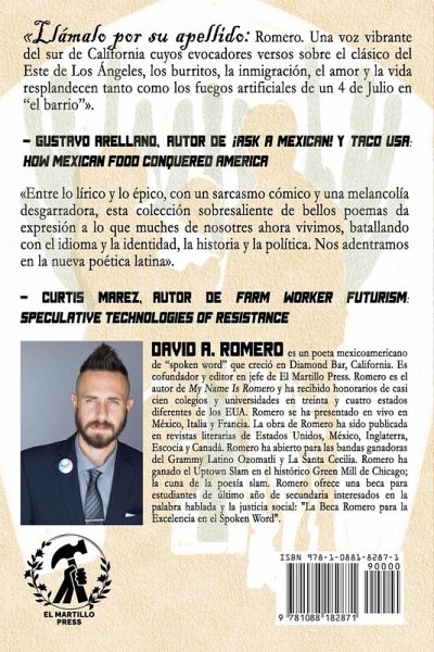Traducción al español de My Name Is Romero (FlowerSong Press, 2020). Gabriel González Núñez, traductor. Yo soy Romero es el tercer poemario completo del poeta de "spoken word" mexicoamericano David A. Romero. En un mundo donde le pronuncian mal el apellido o tratan de definirlo por él, Romero opta por darle significado propio al apellido de su familia mediante una exploración de la historia familiar, los recuerdos de la niñez y los relatos de personas trabajadoras. Al hacerlo, Romero cuestiona sus propios prejuicios y los de les demás en referencia a lo que realmente significa ser mexicoamericane y latine. Yo soy Romero se extiende desde lo político hasta lo personal, con un alcance tanto íntimo como épico. El poemario incluye además una guía de diálogo para abordar temas como la pertenencia y la exclusión, el racismo y la solidaridad. La ilustración de portada es un original de Sonia Romero y el libro ostenta valoraciones de Gustavo Arellano (¡Ask a Mexican! y Taco USA: How Mexican Food Conquered America), Curtis Marez (University Babylon y Farm Worker Futurism: Speculative Technologies of Resistance), Ulises Bella (multinstrumentistä y miembro fundador de Ozomatli), Yolanda Nieves (profesora titular del Colegio Universitario Wilbur Wright, fundadora de Vida Bella Ensemble), Mike The Poet Sonksen (Letters to My City y I Am Alive in Los Angeles), y Ana María Álvarez (fundadora y artista directora de la compañía de danza latina y urbana CONTRA-TIEMPO).