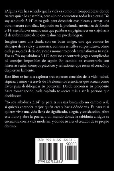 ¿Alguna vez has sentido que la vida es como un rompecabezas donde tú eres quien lo ensambla, pero aún no encuentras todas las piezas? "Yo soy sabiduría 3.14" es tu guía para descubrir esas piezas y armar una obra maestra con ellas. Inspirado en la profunda enseñanza de Éxodo 3:14, este libro es mucho más que palabras en páginas; es un viaje hacia el descubrimiento de lo que realmente puedes lograr. Imagina tener una charla con un buen amigo, uno que conoce los altibajos de la vida y te muestra, con una sencillez sorprendente, cómo cada paso, cada decisión, y cada momento pueden transformar tu vida. Eso es "Yo soy sabiduría 3.14". Aquí no encontrarás jergas complicadas ni consejos imposibles de seguir. En cambio, te encontrarás con historias reales, consejos prácticos y reflexiones que tocan el corazón y despiertan la mente. Este libro te invita a explorar tres aspectos cruciales de la vida - salud, riqueza y amor - a través de 14 elementos esenciales que actúan como llaves para desbloquear tu potencial. Desde encontrar tu propósito hasta tomar acción, cada capítulo te acerca más a ser la persona que decides ser. "Yo soy sabiduría 3.14" es para ti si estás buscando un cambio real, si quieres entender mejor quién eres y hacia dónde vas. Es para ti si quieres vivir una vida llena de significado, alegría y satisfacción. Abre este libro y abre la puerta a un mundo donde la sabiduría antigua se encuentra con la vida moderna, y donde tú eres el creador de tu propio destino.