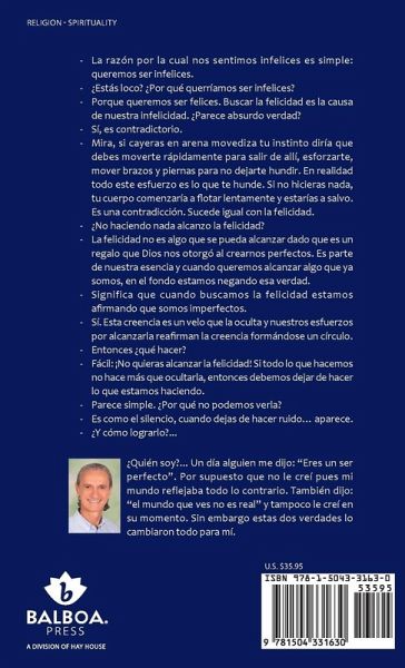 - La razón por la cual nos sentimos infelices es simple: queremos ser infelices. - ¿Estás loco? ¿Por qué querríamos ser infelices? - Porque queremos ser felices. Buscar la felicidad es la causa de nuestra infelicidad. ¿Parece absurdo verdad? - Sí, es contradictorio. - Mira, si cayeras en arena movediza tu instinto diría que debes moverte rápidamente para salir de allí, esforzarte, mover brazos y piernas para no dejarte hundir. En realidad todo este esfuerzo es lo que te hunde. Si no hicieras nada, tu cuerpo comenzaría a flotar lentamente y estarías a salvo. Es una contradicción. Sucede igual con la felicidad. - ¿No haciendo nada alcanzo la felicidad? - La felicidad no es algo que se pueda alcanzar dado que es un regalo que Dios nos otorgó al crearnos perfectos. Es parte de nuestra esencia y cuando queremos alcanzar algo que ya somos, en el fondo estamos negando esa verdad. - Significa que cuando buscamos la felicidad estamos afirmando que somos imperfectos. - Sí. Esta creencia es un velo que la oculta y nuestros esfuerzos por alcanzarla reafirman la creencia formándose un círculo. - Entonces ¿qué hacer? - Fácil: ¡No quieras alcanzar la felicidad! Si todo lo que hacemos no hace más que ocultarla, entonces debemos dejar de hacer lo que estamos haciendo. - Parece simple. ¿Por qué no podemos verla? - Es como el silencio, cuando dejas de hacer ruido... aparece. - ¿Y cómo lograrlo?...