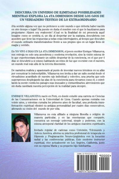 En YO VIVI 4 DIAS EN LA 4TA DIMENSION, Enrique Villanueva, nos entrega no solo una asombrosa y moderna revelación, sino la visión misma de lo que experimentara durante un súbito despertar de la conciencia, en el que por 4 días consecutivos se descubrió a si mismo habitando un reino de luz que co-existe con el nuestro, un mundo real más allá de la tercera dimensión. De narrativa realista y apasionado al punto de inventar nuevos términos en su afán por comunicar lo indescriptible, Villanueva nos invita a dar un salto mortal desde el elevadísimo acantilado de nuestro ego individual y colectivo, una prueba que solo superaremos extendiendo las alas de la conciencia para elevarnos como él, o estrellando la mente contra los paisajes mas inusuales y extraordinarios, atrevimiento que sin duda cambiara nuestra percepción de la realidad para siempre.