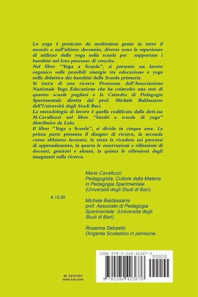 Si tratta di una ricerca Promossa dall'Associazione Nazionale Yoga Educazione che ha coinvolto una rete di quattro scuole pugliesi e La cattedra di pedagogia sperimentale diretta dal prof. Michele Baldassarre dell'Università di Bari. La metodologia di lavoro è quella codificata dalla dott.ssa Cavalluzzi nel libro "bimbi a scuola" di yoga Ed. Lulu. Il libro "Yoga a scuola" si divide in cinque aree. La prima parte presenta il disegno di ricerca, la seconda, come abbiamo lavorato; la terza, la ricaduta sui processi di apprendimento; la quarta, le osservazioni e riflessioni di docenti genitori e alunni; la quinta, le riflessioni dei docenti sulla ricerca.