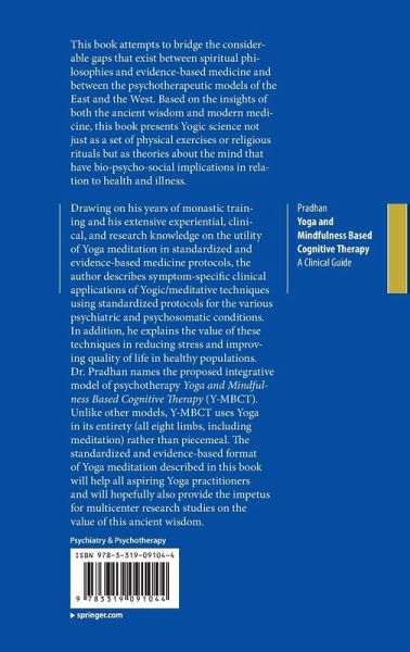 Drawing on his years of monastic training and his extensive experiential, clinical and research knowledge on the utility of Yoga meditation in standardized and evidence-based medicine protocols, the author describes symptom-specific clinical applications of Yogic/meditative techniques using standardized protocols for the various psychiatric and psychosomatic conditions. In addition, he explains the value of these techniques in reducing stress and improving quality of life in healthy populations. Dr. Pradhan names the proposed integrative model of psychotherapy Yoga and Mindfulness Based Cognitive Therapy (Y-MBCT). Unlike other models, Y-MBCT uses Yoga in its entirety (all eight limbs, including meditation) rather than piecemeal. The standardized and evidence-based format of Yoga meditation described in this book will help all aspiring Yoga practitioners and will hopefully also provide the impetus for multicenter research studies on the value of this ancient wisdom.