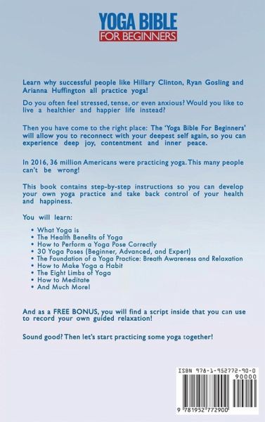 Improve Your Health With Yoga Learn why successful people like Beyoncé, Ryan Gosling, and Arianna Huffington all practice yoga! Get access to 30 yoga poses with step-by-step instructions to develop your own yoga practice. Do you often feel stressed, tense, or even anxious? Would you like to live a healthier and happier life instead? Now you can: 'The Yoga Bible For Beginners' will allow you to reconnect with your deepest self again, so you can experience deep joy, contentment and inner peace. Get Your Copy of 'The Yoga Bible For Beginners' Moreover, yoga has been shown to alleviate symptoms of: - Back pain - Scoliosis - Fibromyalgia - Heart disease - Stress As well as help to: - Become more flexible - Normalize blood pressure, and - Lose weight And that's just the tip of the iceberg! Get Your Hands on 'The Yoga Bible For Beginners' According to a recent study, the number of Americans that practice yoga regularly has grown from 20.4 million in 2012 to a staggering 36 million in 2016! And that number has likely only increased since then. This many people can't be wrong... In today's world, we are constantly stimulated and tempted to keep up with Joneses. As a result, many people have lost the connection between their mind and body. Sound familiar? Yoga can help restore this balance. For example, one study showed that yoga - even when practiced for the very first time! - can lower cortisol levels, a stress hormone. Why You Should Check Out 'The Yoga Bible For Beginners': In this book, I will take you by the hand. I'll teach you how you can: - develop your own yoga practice in the safety of your own home, and - take back control of your health and happiness. Here's What You Will Learn: - What is Yoga? - The Health Benefits of Yoga - How to Perform a Yoga Pose Correctly - 30 Yoga Poses (Beginner, Advanced, and Expert) - The Foundation of a Yoga Practice: Breath Awareness and Relaxation - How to Make Yoga a Habit - The Eight Limbs of Yoga - How to Meditate - And Much More! And as a FREE BONUS, you'll also receive: - Bonus 1: 5 most common yoga mistakes: how can you avoid them? - Bonus 2: a script inside that you can use to record your own guided relaxation. If you apply what you will learn in 'The Yoga Bible For Beginners', your life will never be the same. So, take out your mat and get ready for your first pose! Let's get started, shall we? Take action now! Scroll to the top of this page and click the Buy Now button.
