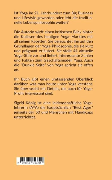 Ist Yoga im 21. Jahrhundert zum Big Business und zum Lifestyle geworden oder lebt die traditionelle Lebensphilosophie weiter?Die Autorin wirft einen kritischen Blick hinter die Kulissen des heutigen Yoga-Marktes mit all seinen Facetten. Sie beleuchtet ihn auf den Grundlagen der Yoga-Philosophie, die sie kurz und prägnant erläutert. Sie stellt 41 aktuelle Yoga-Stile vor und liefert interessante Zahlen und Fakten zum Geschäftsmodell Yoga. Die Dunkle Seite von Yoga spricht sie offen an.Ihr Buch gibt einen umfassenden Überblick darüber, was man heute unter Yoga versteht. Sie überrascht mit Details, die auch für Yoga-Profis interessant sind.