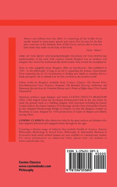 Silence and stillness have the effect of conserving all the bodily forces usually wasted in unnecessary speech and action. You become for the first time conscious of the rhythmic flow of life's forces, and are able to hear the faint music they make on the harp of the body. -from "Silence" One of the most extraordinary figures of the popular intellectualism of the early 20th century, Claude Bragdon was an architect and designer who turned his mathematically fueled artistic bent toward the metaphysical. Here, in wise, insightful prose, Bragdon offers an introduction-first published in 1943-to the philosophy of yoga as an aid to expanding the human consciousness. From mastering the art of concentration to finding new depth in sexuality, this is a frank, perceptive call to rethink how we live our lives in the modern world. Other works by Bragdon available from Cosimo Classics: The Eternal Poles, Four-Dimensional Vistas, Projective Ornament, The Beautiful Necessity, Architecture and Democracy, Episodes from An Unwritten History, and A Primer of Higher Space (The Fourth Dimension). American architect, stage designer, and writer CLAUDE FAYETTE BRAGDON (1866-1946) helped found the Rochester Architectural Club, in the city where he made his greatest mark as a building designer with structures including Rochester Central Station, Rochester Institute of Technology, and the First Universalist Church; he also designed Peterborough Bridge in Ontario. In later life, Bragdon worked on Broadway as scenic designer for 1930s productions of Cyrano de Bergerac and Hamlet, among others.