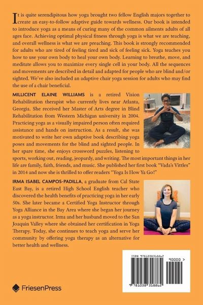 It is quite serendipitous how yoga brought two fellow English majors together to create an easy-to-follow adaptive guide towards wellness. Our book is intended to introduce yoga as a means of curing many of the common ailments adults of all ages face. Achieving optimal physical fitness through yoga is what we are teaching, and overall wellness is what we are preaching. This book is strongly recommended for adults who are tired of feeling tired and sick of feeling sick. Yoga teaches you how to use your own body to heal your own body. Learning to breathe, move, and meditate allows you to maximize every single cell in your body. All the sequences and movements are described in detail and adapted for people who are blind and/or sighted. We've also included an adaptive chair yoga session for adults who may find the use of a chair beneficial.