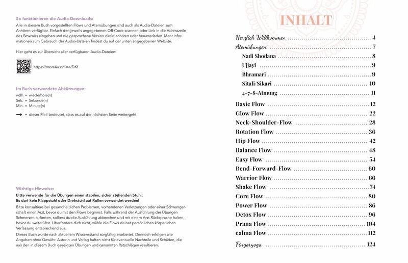Tolles Extra: Alle 15 Flows und die Atemübungen sind auch als Audio-Dateien zum Anhören mittels QR-Code verfügbar. Wenn du bereits mit den Bewegungsabläufen vertraut bist, hörst du dir einfach die von der Autorin eingesprochenen Anleitungen an und kannst, wann immer dir danach ist, auch ohne Buch in deinen persönlichen Flow kommen.